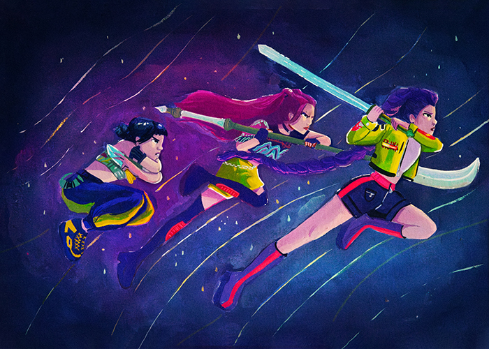Zoey, Rumi, and Mira (HUNTR/X girls) ready to slay some demons! Originally painted in gouache